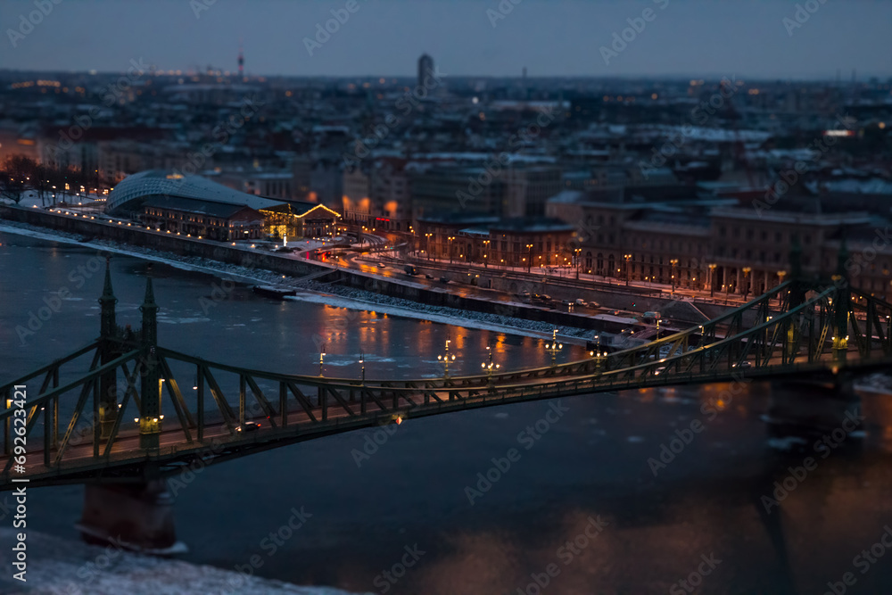 View of the city at dusk. Budapest Hungary, tilt-shift effect