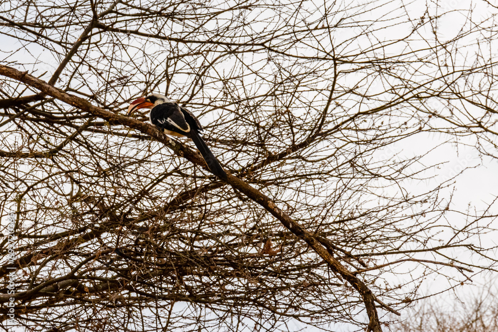 Bird of hornbill family (Bucerotidae) Von der Decken's hornbill (Tockus deckeni) on a tree branch. Serengeti national park, Tanzania