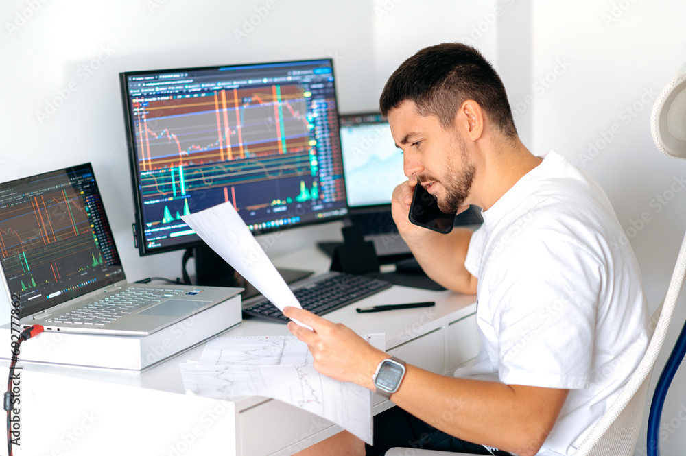 Busy caucasian male crypto trader sitting at home at his work desk in front of monitors with graphs, talking on the smart phone with colleague, discussing the prospects of cryptocurrency, profit