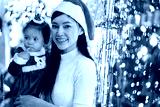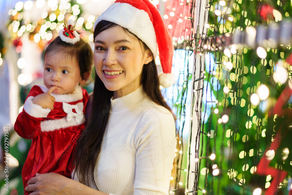 happy mother with daughter in santa dress and the christmas tree. happy new year eve