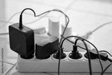 Overloaded power boards. Power strips with different electrical plugs on white floor. Concept of risk danger overloaded current electrical