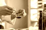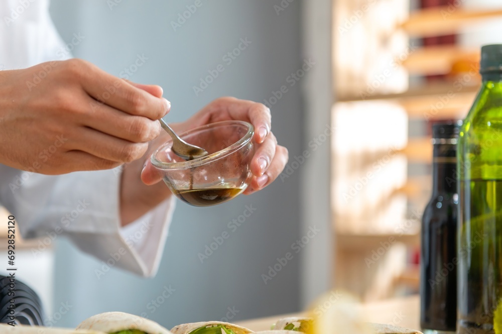 chef make tortilla wrap vegetable salad slice by knife on cutting board and mix sour salad dressing in small bowl glass with wine and olive oil. tortillas wrap vegetable and juicy liquid sour dressing