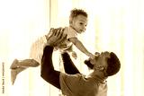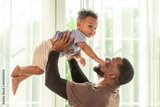 Happy african black parents dad father throw baby son on piggyback and neck riding teasing fun near window. Black baby son and daddy enjoy teasing kiss cheek and neck riding at window light