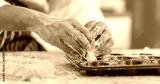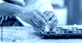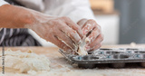 professional Chef sifting flour powder and sprinkling ingredients on massaging dough for bakery cooking. Chef show dirty finger hand sifting flour wheat and kneading dough mixing powder.