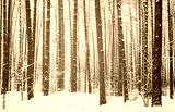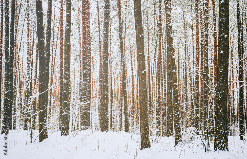 Snowfall in a pine forest on a winter cloudy day. Pine trunks covered with snow. Vintage film aesthetic.