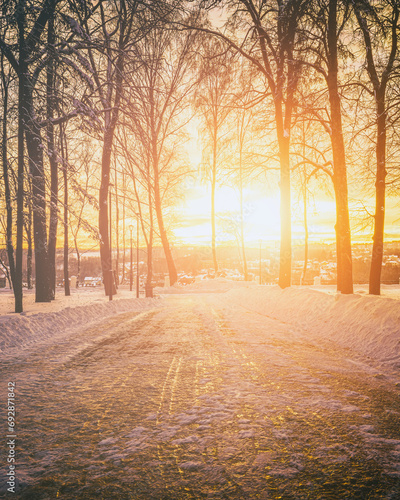 Sunset or dawn in a winter city park with trees, benches and sidewalks covered with snow and ice. Vintage film aesthetic.