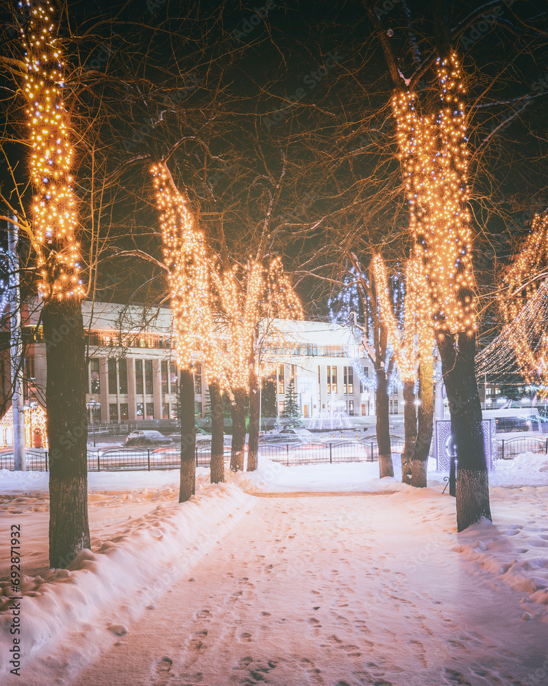 Winter park at night with christmas decorations, glowing lanterns, pavement covered with snow and trees. Vintage film aesthetic.