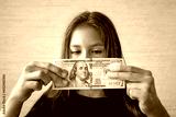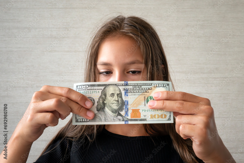 children's money. Money, finances and people concept - smiling little girl with dollar cash money