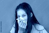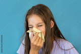 A cold girl blows her nose in a white rag on blue background. Influenza or Rhinitis snot runny nose stuffy nose. Allergy young girl holding yellow handkerchief. Medical concept.