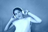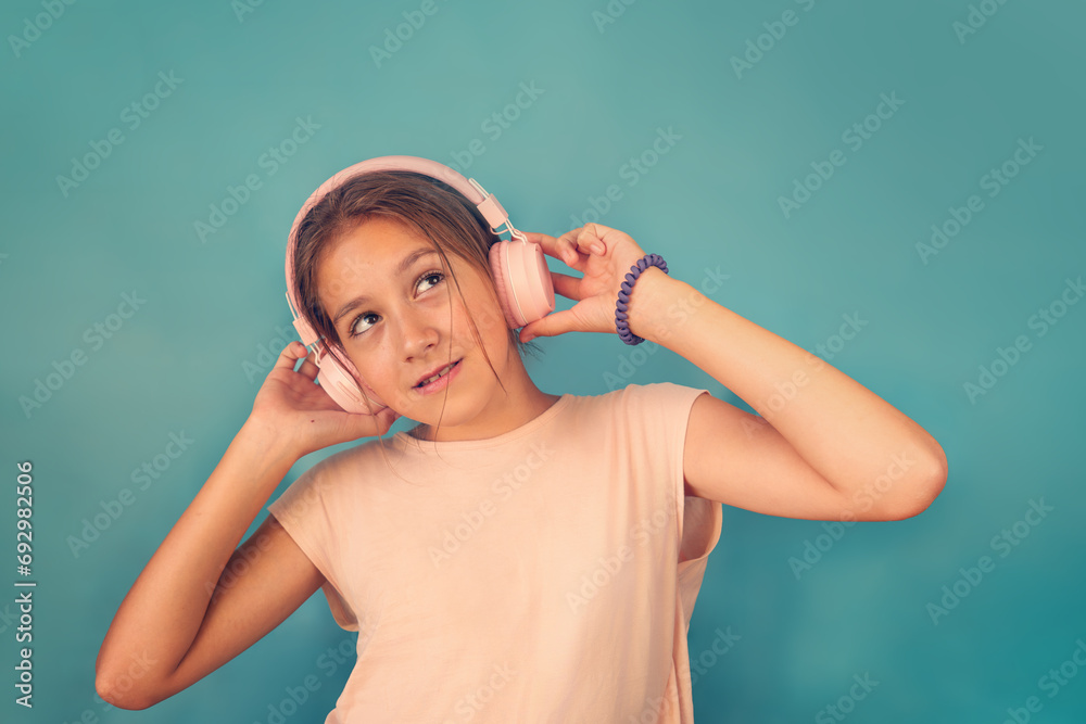Vivid and fun emotions, happy child with pleasure listens to songs in wireless headphones. Happy smiling child girl enjoys listens to music in headphones over blue background.
