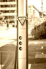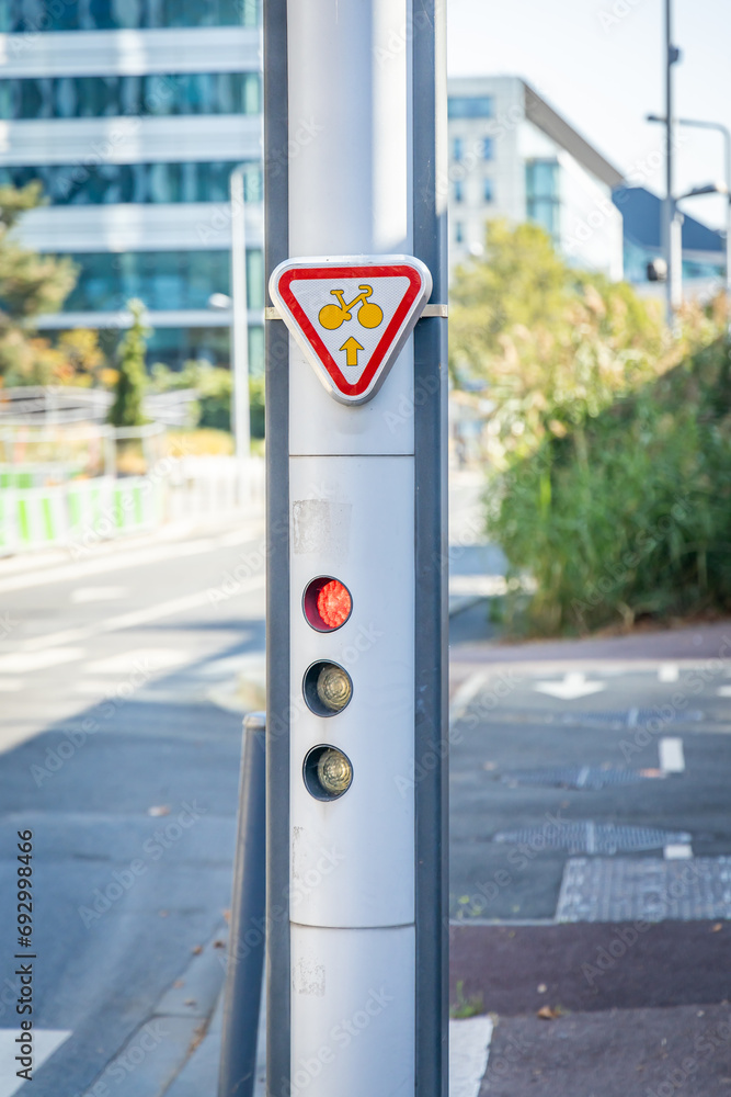 Red traffic light and M12 sign authorizing cyclists to cross the lights
