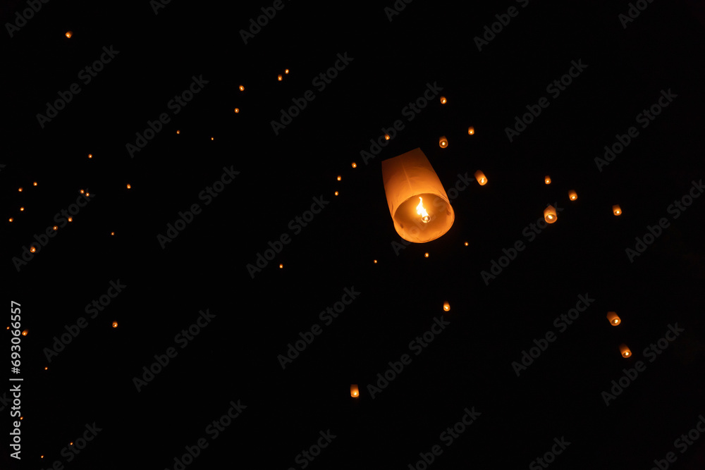 Thai people release sky floating lanterns or lamp to worship Buddha's relics at night. Traditional festival in Chiang mai, Thailand. Loy krathong