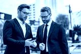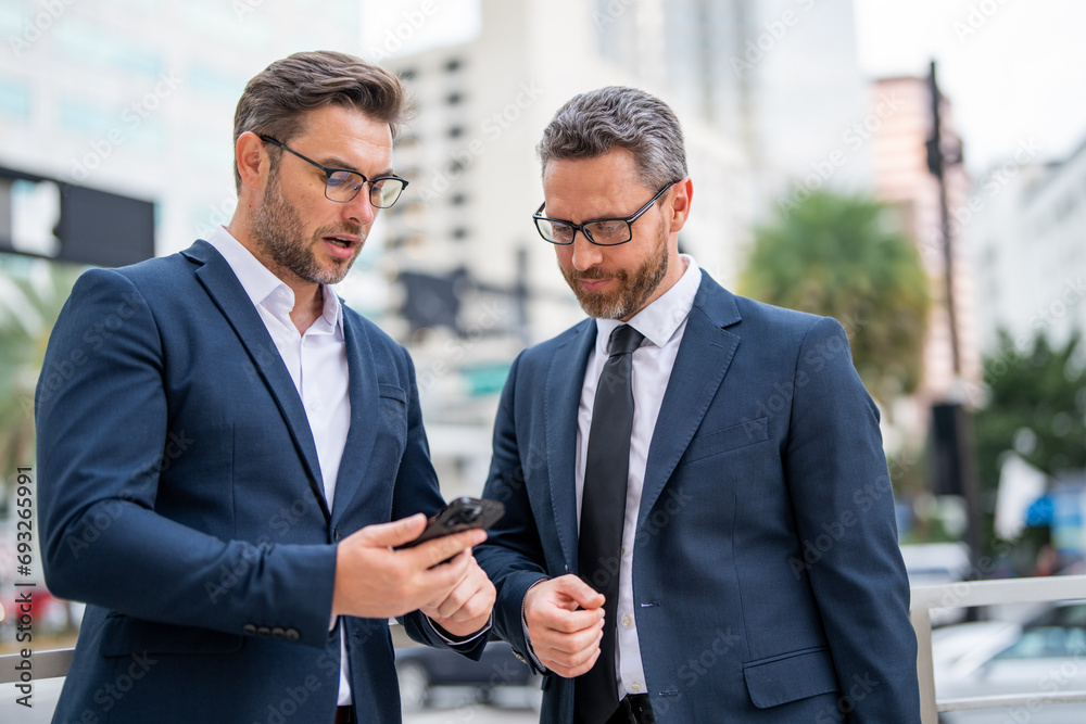 Businessmen using mobile phone outdoor. Confident mature businessman talking on mobile phone while walking outside. Business men looking at messages on cellphone in the street in downtown of city.