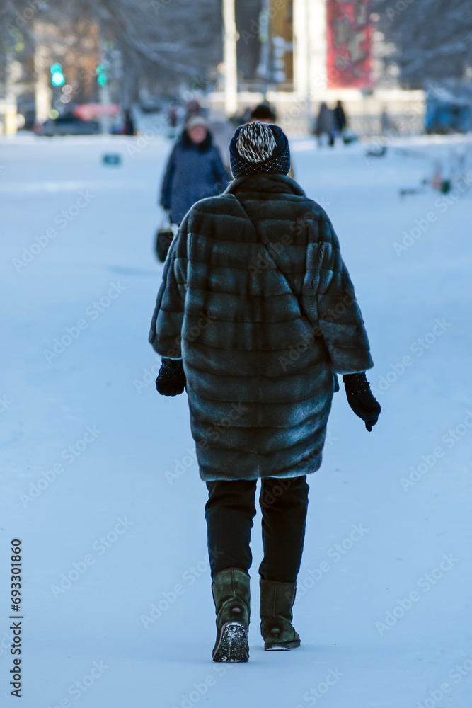 A woman walks along a snow-covered sidewalk on a winter day