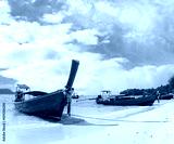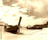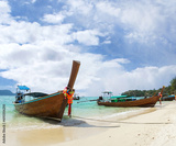 Thai traditional wooden longtail boat and beautiful sand beach in Thailand. Traveling concept.