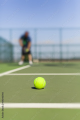 tennis ball and player on hard court