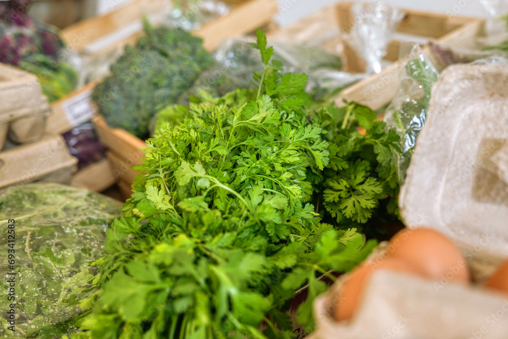 farmers market, parsley, eggs and fresh herbs in a colorful bunch of fresh veggies and proteins