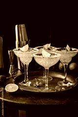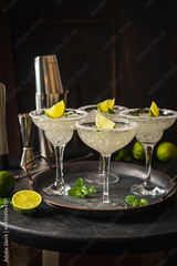 Margarita cocktail with lime and ice on dark wooden table with copy space. Classic Margarita and Daiquiri Cocktail.