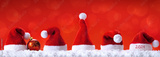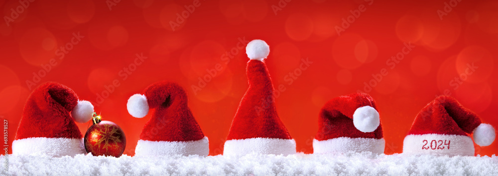 Happy new Year 2024 background with red Santa Hats on white snow.