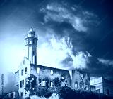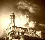 Vintage picture of dramatic rainy sky over Alcatraz Island, san francisco, usa.