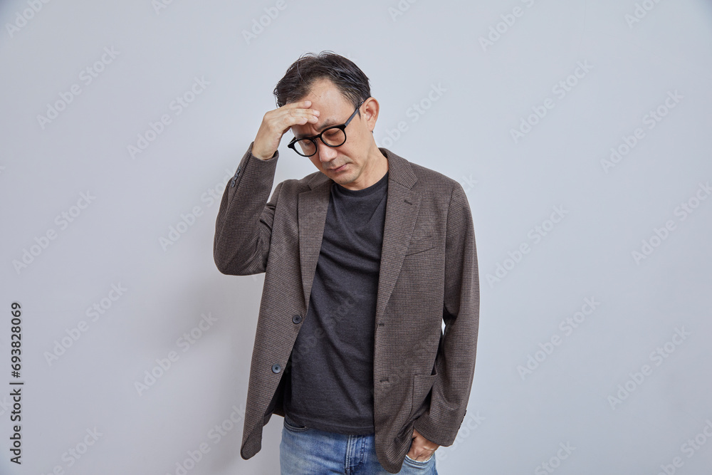 Portrait of stressed Japanese businessman in suit having headache on grey background.