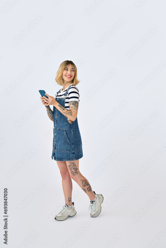 Happy gen z blonde young woman, girl with tattoos wearing striped t-shirt denim dress holding smartphone using mobile cell phone standing isolated on white background looking aside, full body.