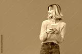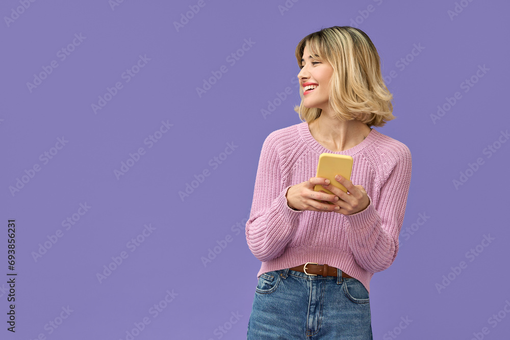 Happy pretty gen z blonde young woman model holding smartphone looking at copy space aside, smiling girl using mobile apps on cell phone standing isolated on purple background with cellphone.