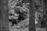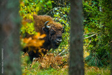 European bison in forest during autumn, fall in Bialowieza Forest, Poland