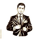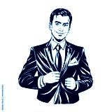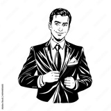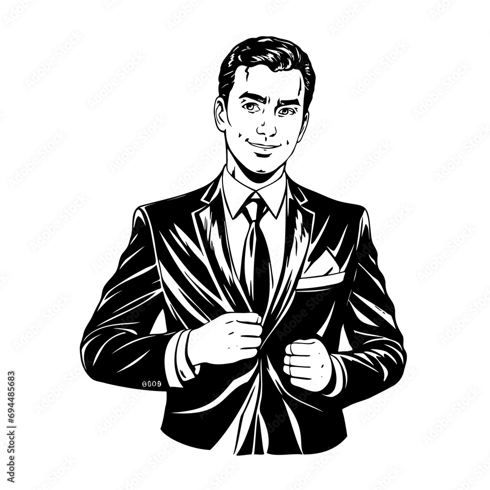 A young man in a business suit. Black and white portrait of a young man. Character avatar icon. Flat isolated illustration on white background. Pop art retro vector illustration.