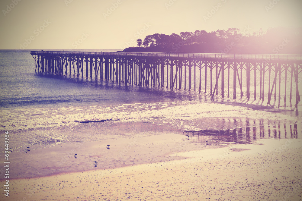 Vintage wood sea bridge at sunset, California, USA.