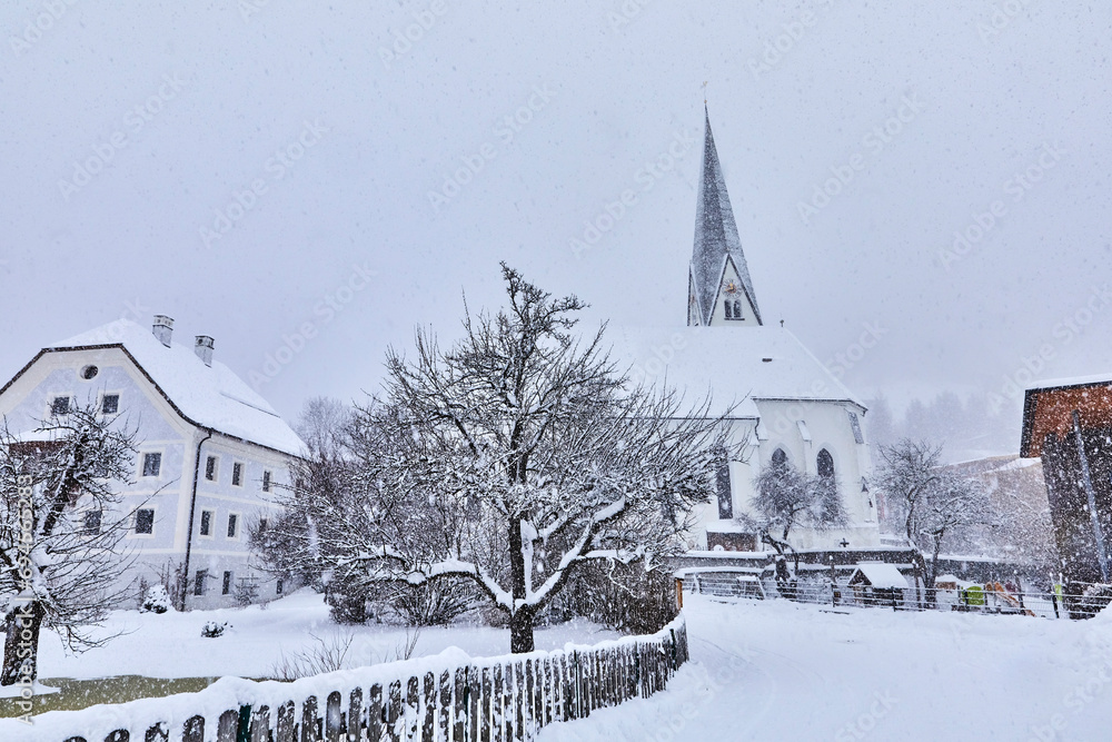 View of snow-covered Bramberg, with the village church in Salzburger Land, Austria,