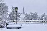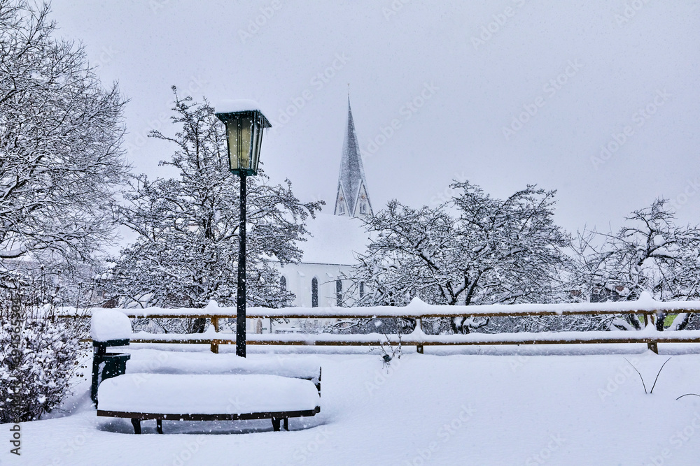 View of snow-covered Bramberg, with the village church in Salzburger Land, Austria,