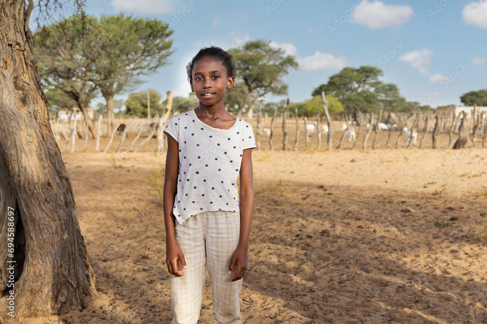 village , african girl at the farm, kraal with goats in the background, Kalahari small livestock