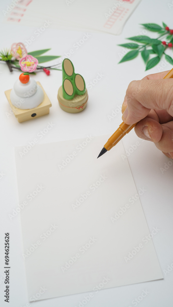 日本の年賀状イメージ(白背景)|年賀状・筆ペン・門松・鏡餅