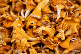 Background with raw food, fresh forest chanterelle or galletti mushrooms.