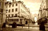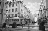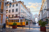 Lisbon, Portugal. Yellow touristic retro tram. Triumphal Arch of Rua Augusta near Praca do Comercio (Commercial Square. Sunny day in famous tourist place Lisboa
