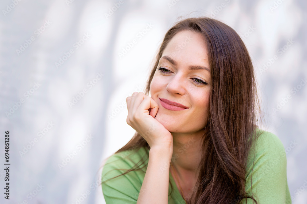 Portrait of beautiful young woman with green eyes and brunette haired against white background