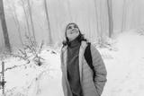 Happy caucasian woman in yellow jacket enjoying walking and snowfall in winter forest, exposing her face to snowflakes