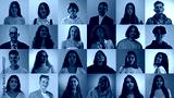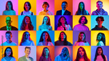 Collage made of different young people, men and women smiling over multicolored background in neon light. Concept of human emotions, diversity, lifestyle, facial expression