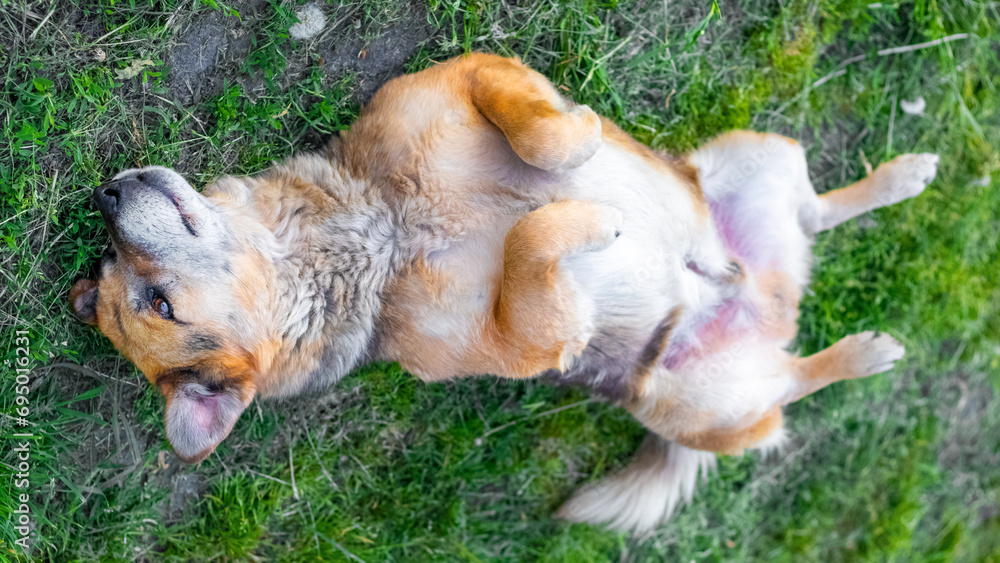 Funny good-natured dog lying with his paws up in the park on the green grass