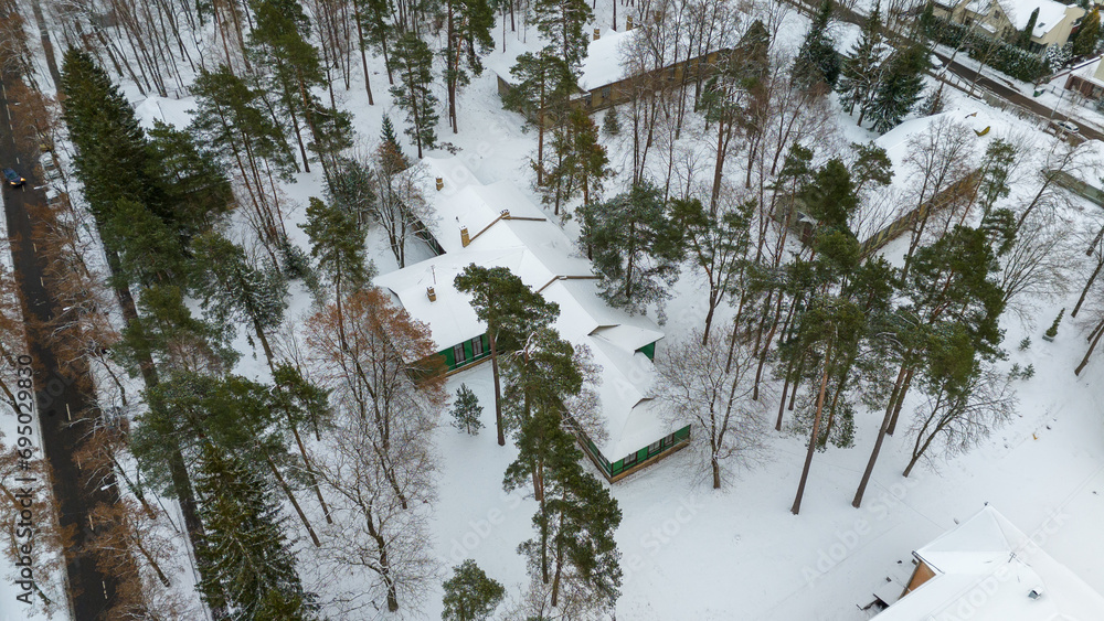 Drone photography of old abandoned wooden house in a forest during winter