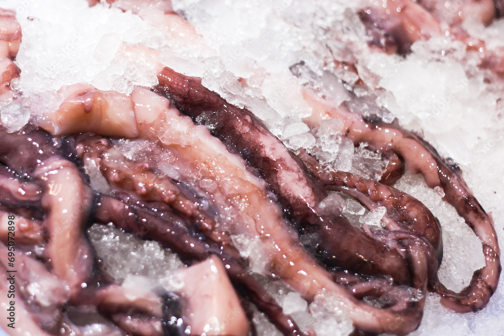 Octopus tentacle on ice. Seafood background. Supermarket seafood shopping. Raw fresh octopus chilled in ice.