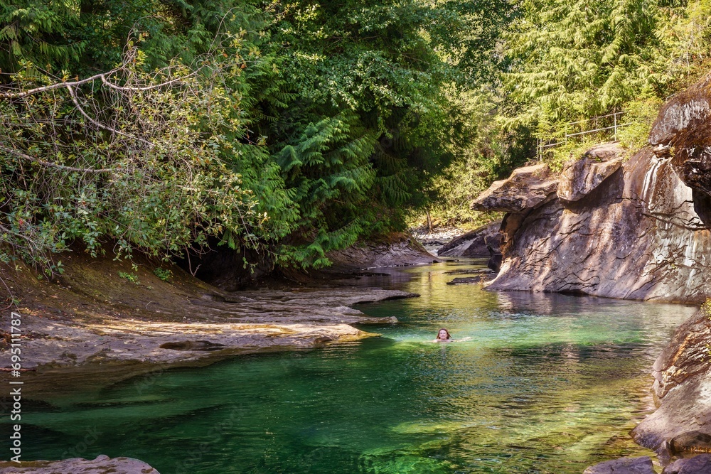 Girl swimming at Oyster River Potholes, British Columbia, Canada