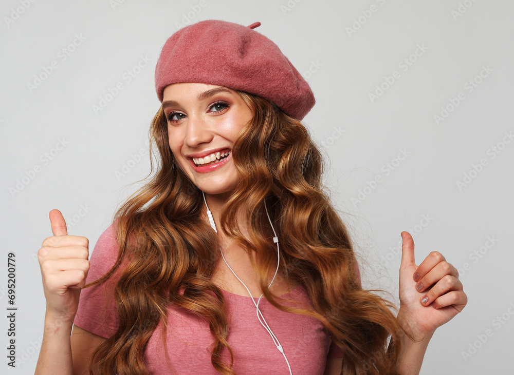 Young woman with blond curly hair wearing a pink t-shirt and beret over grey background.