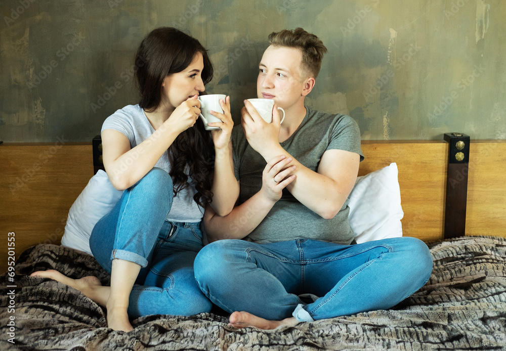 Young couple in love hugging and kissing with mugs on the bed.