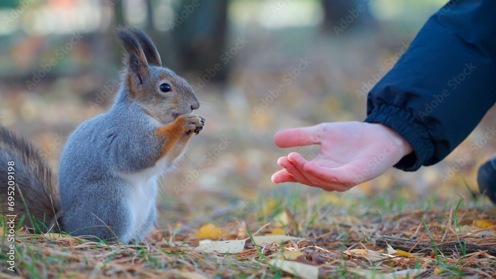 Close-up of a child's hand feeding nuts to a curious hungry furry squirrel. The child shares food with the squirrel and provides support to the mammal. Caring for the environment.