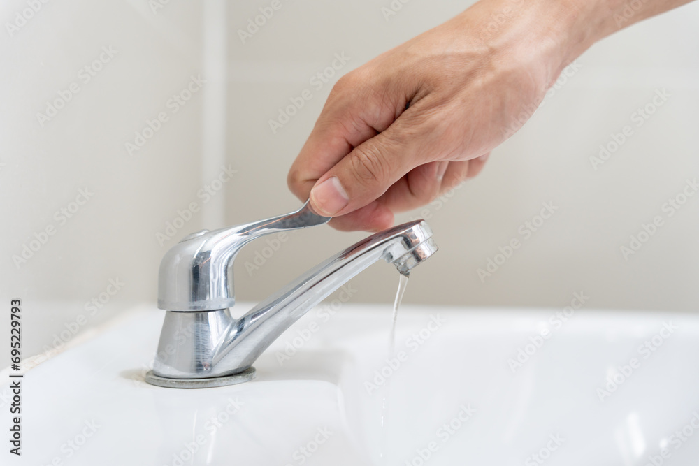 Save water. Volunteer keeps turning off the running water in the bathroom to protect environment. Greening planet, reduce global warming, Save world, life, future, risk energy, crisis , water day.
