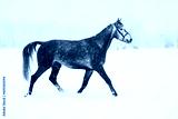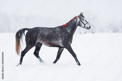 beautiful grey horse with red ribbons in mane trotting through the snow