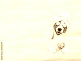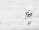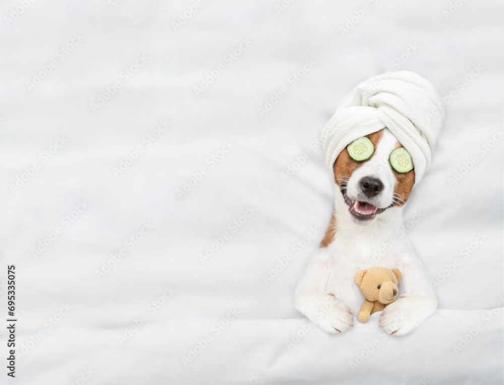 Funny jack russell terrier puppy wearing eyeglasses with towel on it head lying on a bed at home and hugging toy bear before bedtime. Top down view. Empty space for text