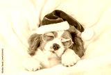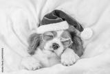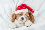Cozy Cavalier King Charles Spaniel puppy wearing red santa hat sleeps under white blanket on a bed at home. Top down view